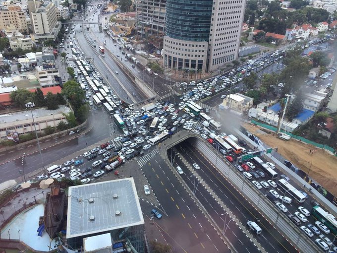 this was posted to twitter by Chezki Shechter, stating that this was the view from Azrieli Towers in Tel Aviv earlier today... (he jokingly compared it to the game of Rush Hour and challenged people to find the 6 ways posisble to get the red car out of the traffic jam..).