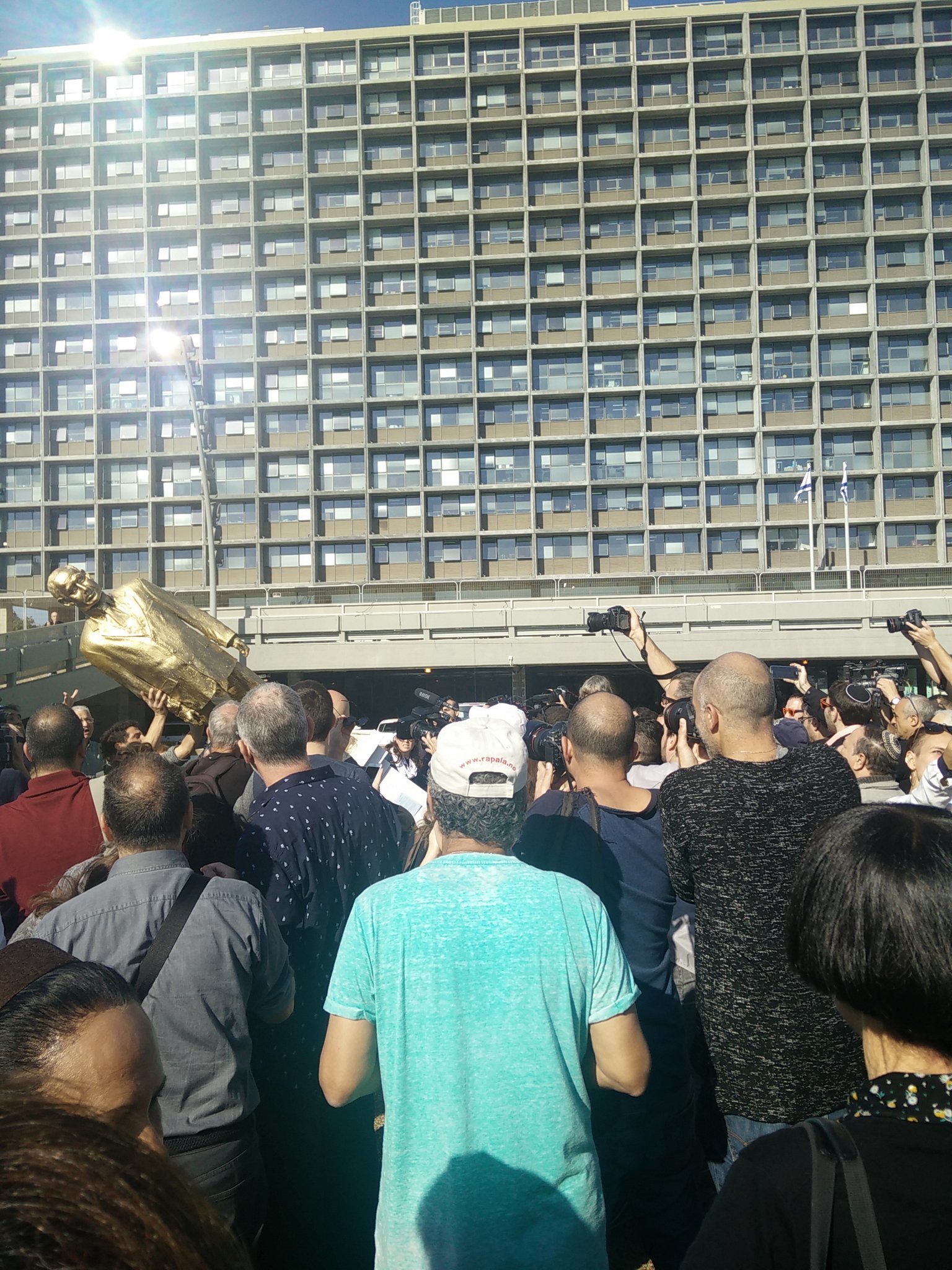 "somebody" placed a golden statue of Bibi Netanyahu in Kikar Rabin this morning. Eventually the statue was knocked down by the public before it was removed.