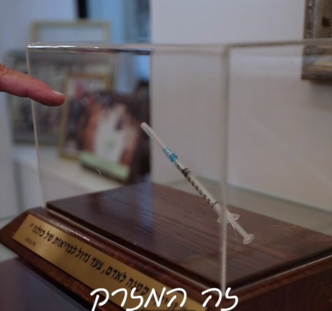 PM Netanyahu put the syringe that delivered the first dose of the Pfizer VOCID-19 vaccine in Israel [into his arm] on display in his office, with the quote below it "A small injection for man and a giant step for the health of us all" - quoting himself.